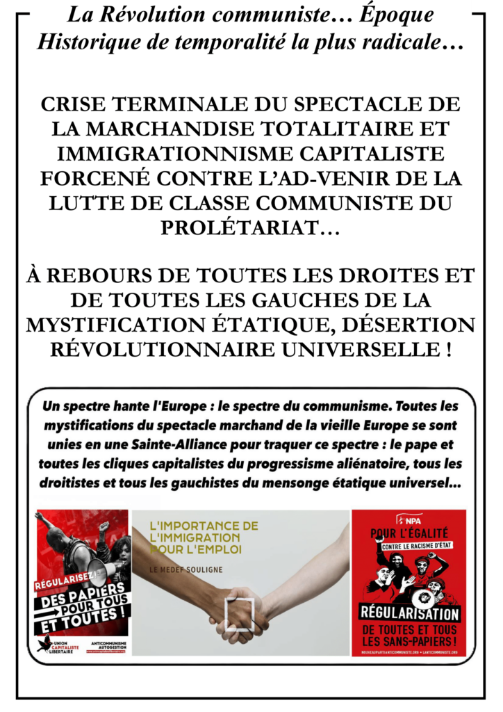CRISE TERMINALE DU SPECTACLE DE LA MARCHANDISE TOTALITAIRE ET IMMIGRATIONNISME CAPITALISTE FORCENÉ CONTRE L’AD-VENIR DE LA LUTTE DE CLASSE COMMUNISTE […]