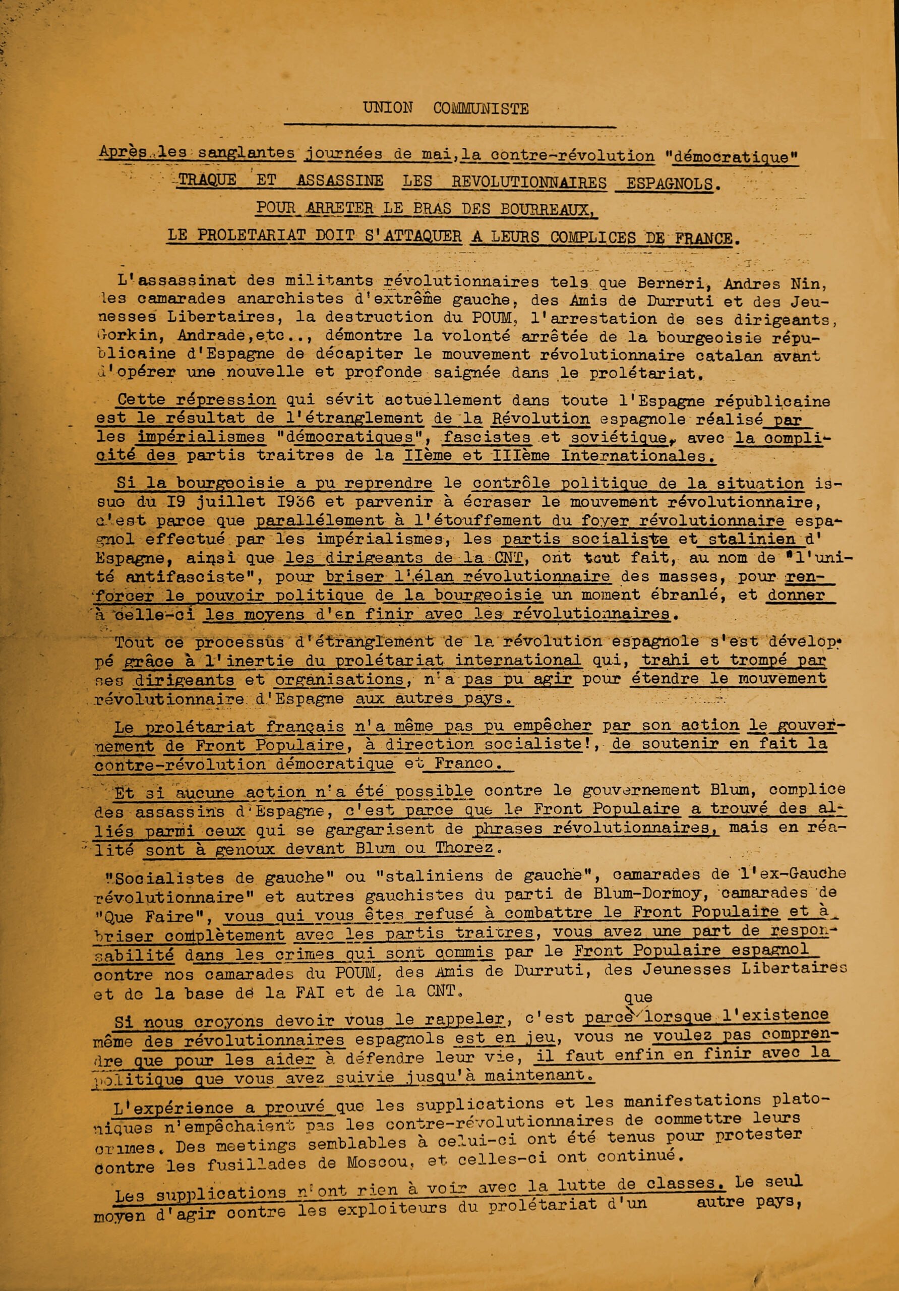 Il y a tout juste presqu’un siècle, le groupe Union Communiste, en défense intransigeante de la perspective révolutionnaire, insistait déjà sur cette invariance historique qui veut que le mouvement réel de l’auto-émancipation prolétarienne ne puisse surgir qu’en pulvérisant les cadenassages idéologiques et policiers de tous les flics politiques de la gauche du Capital, toujours et partout à l’avant-garde des massacres ouvriers, de la Commune de Paris à celle de Berlin…