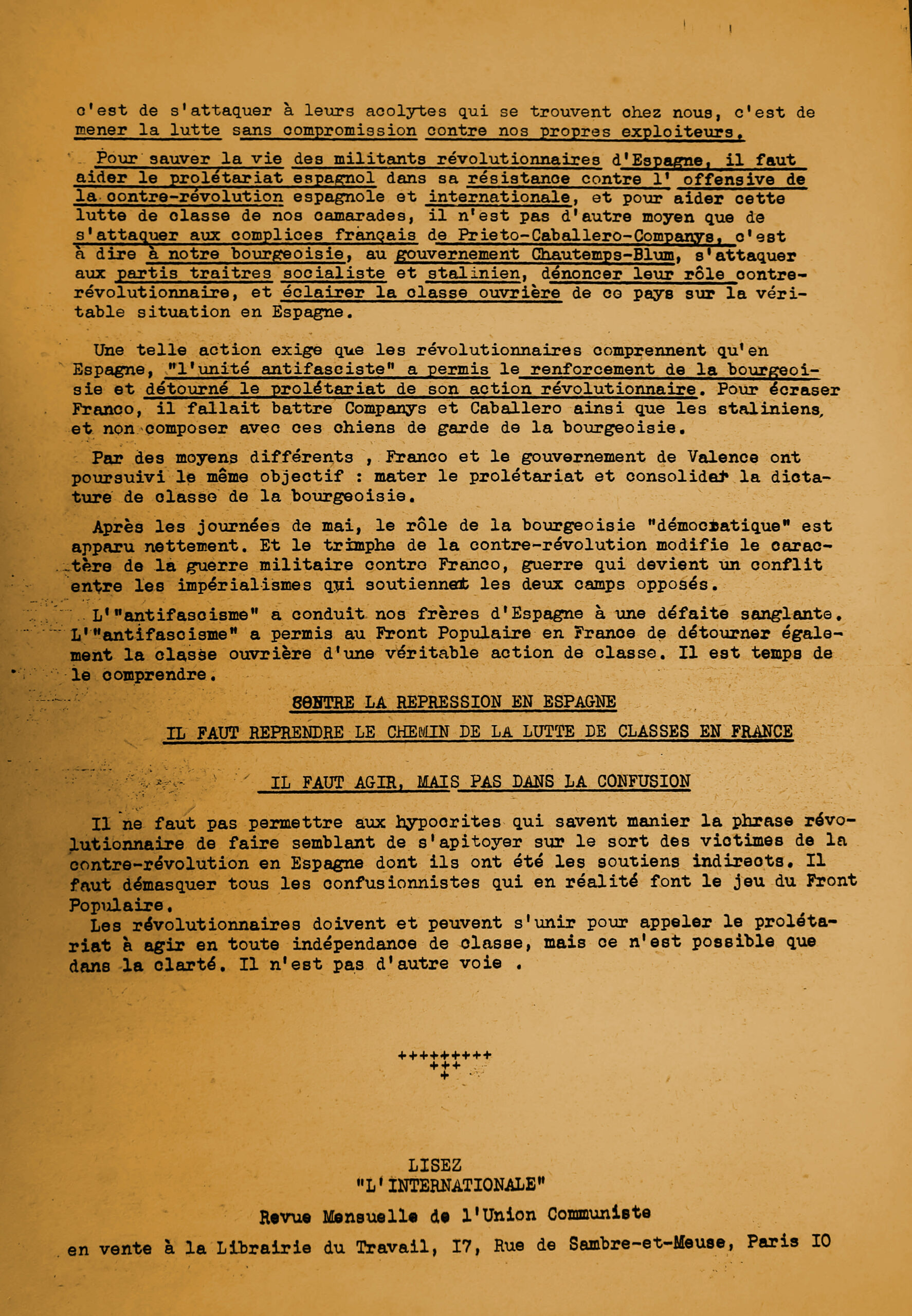 Aujourd’hui, dans la filiation conservée/dépassée des camarades de l’Union Communiste, les jalons de conscience communisatrice des circonstances actuelles, appliquant pleinement la dialectique méthodologique et prévisionnelle des Grundrisse et du Capital, ont réponse à la Totalité de ce qui survient car, dans leur questionnement du Tout mondial, ils récoltent avec humilité et vertu ; le mouvement réel d’ensemble de la crise ultime du spectaculaire marchand en toute sa finalité générale. Aussi, puisque la schizophrénie mégapolitaine de l’usine globale réalisée qui correspond à la phase historique advenue de la crise terminale du spectacle de la valeur d’échange est en train d’achever son périgée, toutes les falsifications qui permirent de transformer la Belle insurrection ouvrière et paysanne de juillet 1936 en misérable et sordide guerre capitaliste – dès lors que les milices prolétaires furent converties en simples bataillons militaires du clivage capitaliste – reviennent en un accéléré cumulatif de totalitarisme terroriste absolu qui incarne pleinement l’exhaustivité parfaite de ces mensonges si déconcertants qui conduisirent Orwell à parachever Hommage à la Catalogne en 1984.