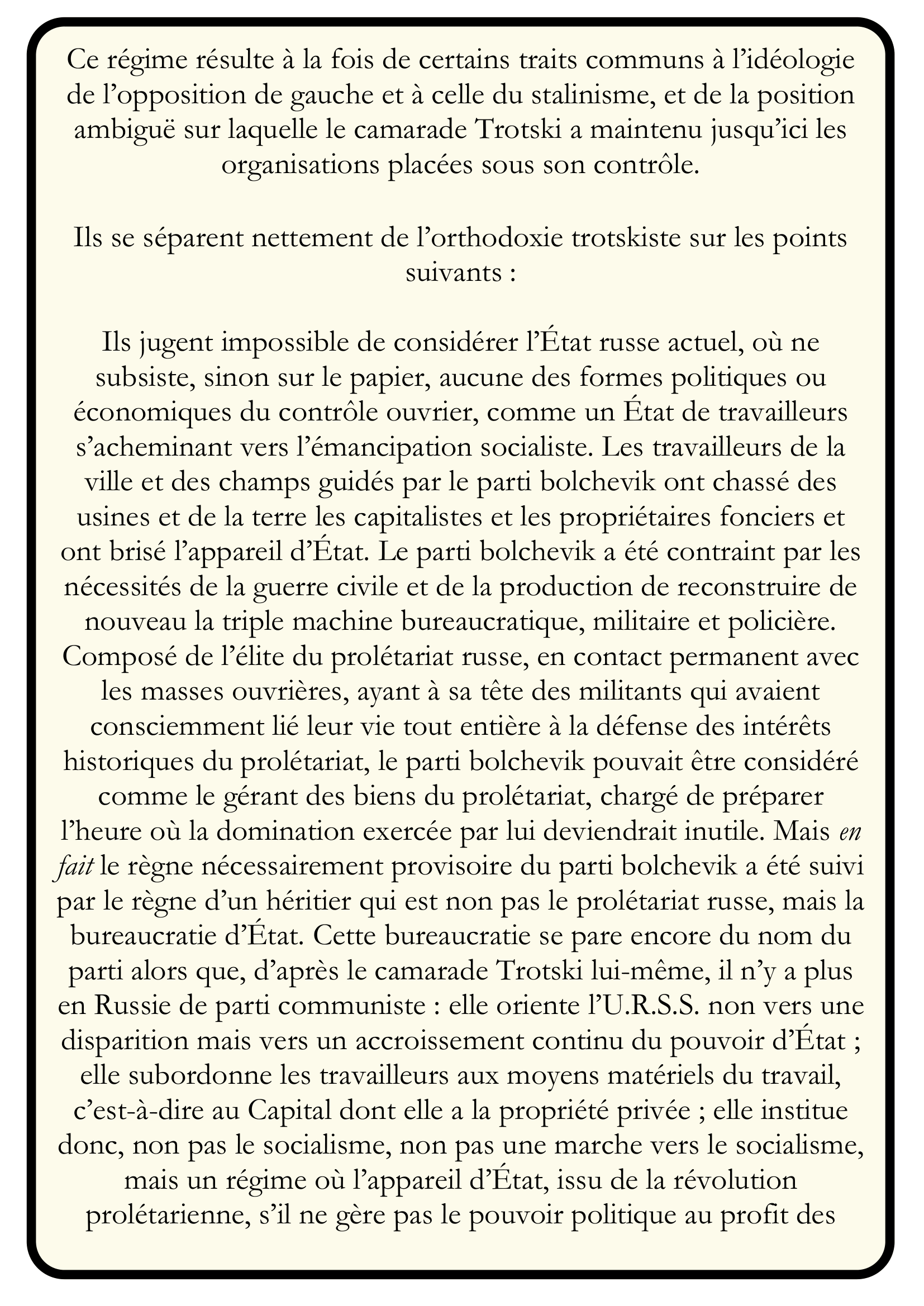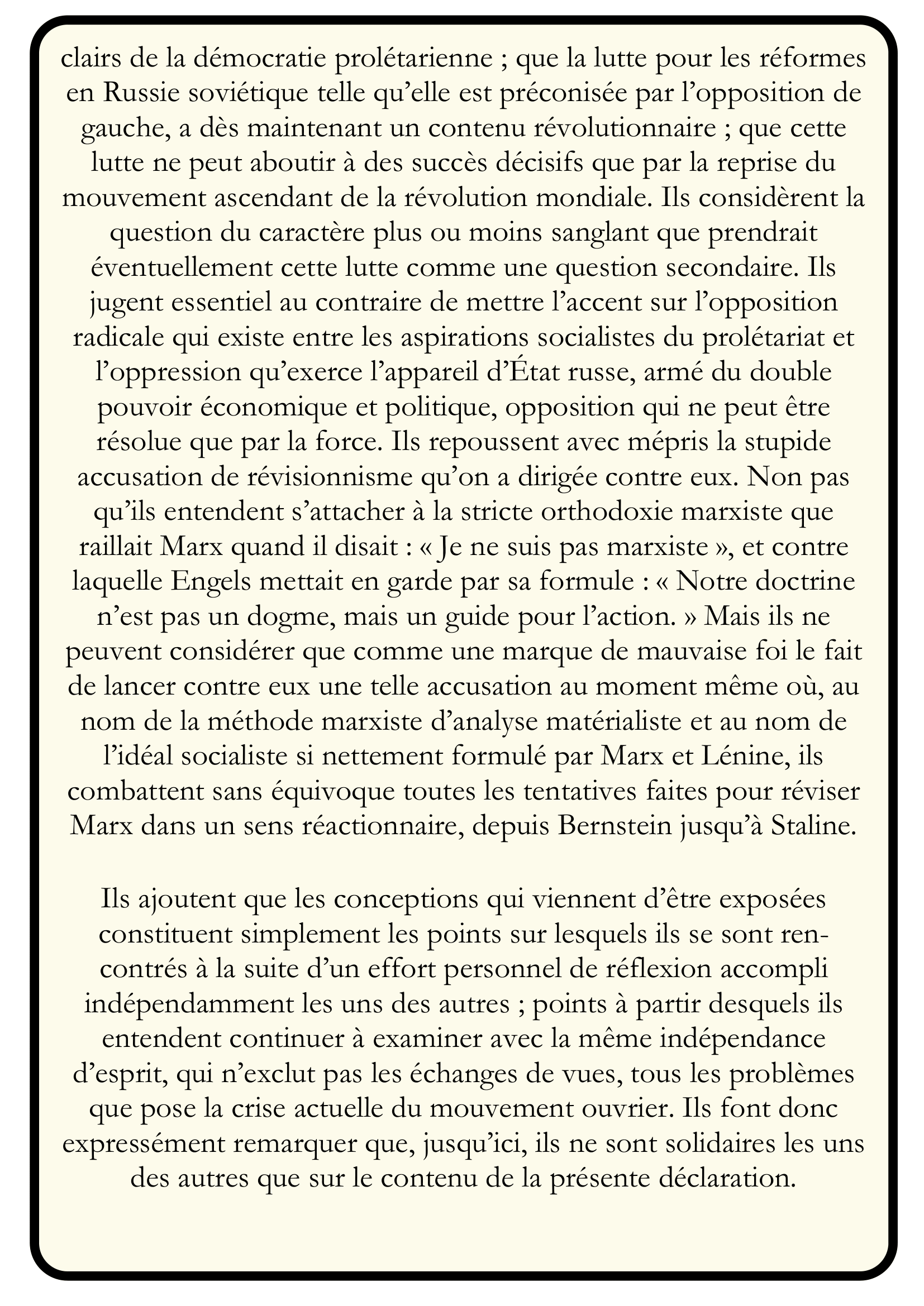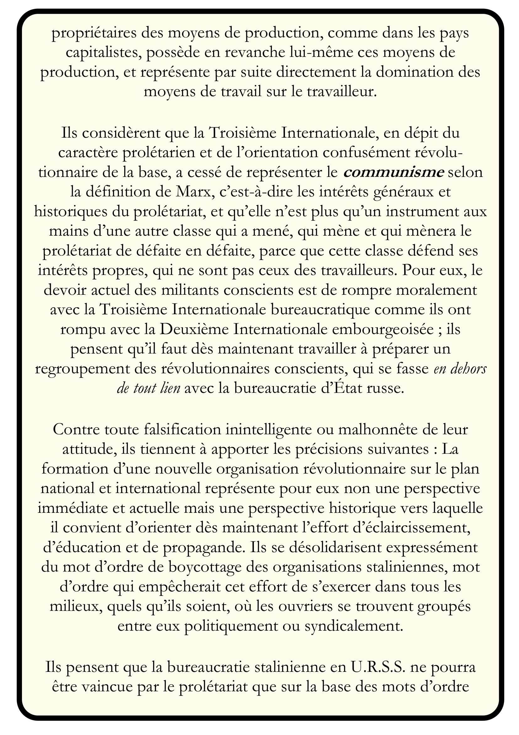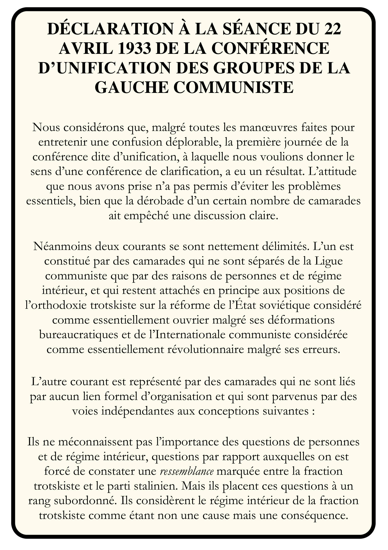 La Conférence d’Unification des groupes de la Gauche communiste avait été enclenchée par plusieurs groupes ouvriers qui s’interrogeaient, en ce début d’année 1933, sur la faisabilité de susciter une perspective révolutionnaire à partir d’orientations nettement affirmées. Diverses réunions se succédèrent… Les trotskistes quittèrent hâtivement le processus engagé puisque Trotski, en bon Staline manqué, s’obstinait à regarder la machinerie capitaliste de l’État soviétique comme « essentiellement ouvrière » en dépit de ses « déformations bureaucratiques » et qu’il estimait que l’Internationale des polices stalinistes demeurait « révolutionnaire malgré ses erreurs ». De plus, Trotski était encore adversaire de la fondation d’une Quatrième Internationale alors que les signataires de la déclaration soutenaient, eux, le principe d’une telle constitution.