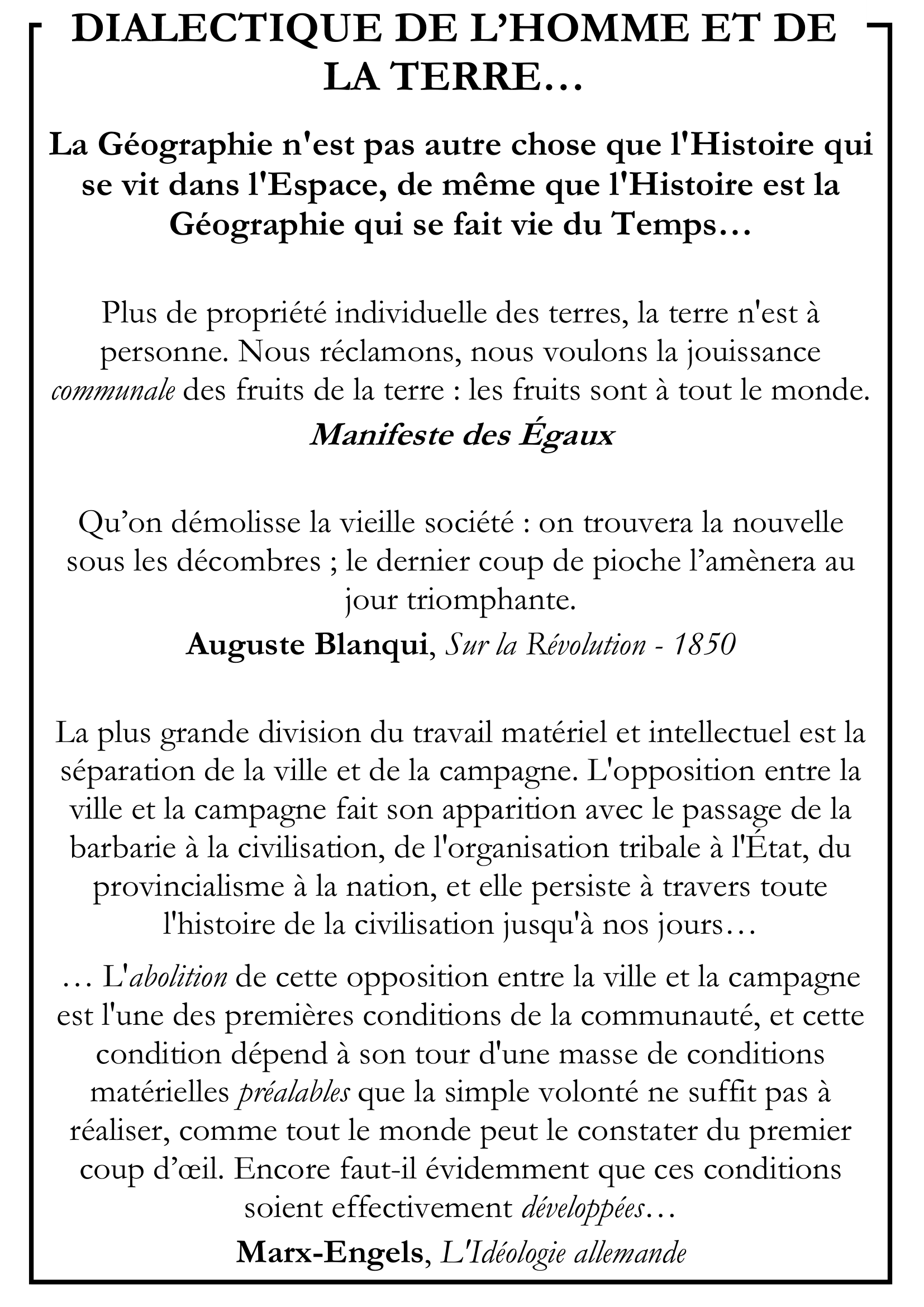 … L’abolition de cette opposition entre la ville et la campagne est l’une des premières conditions de la communauté, et cette condition dépend à son tour d’une masse de conditions matérielles préalables que la simple volonté ne suffit pas à réaliser, comme tout le monde peut le constater du premier coup d’œil. Encore faut-il évidemment que ces conditions soient effectivement développées…