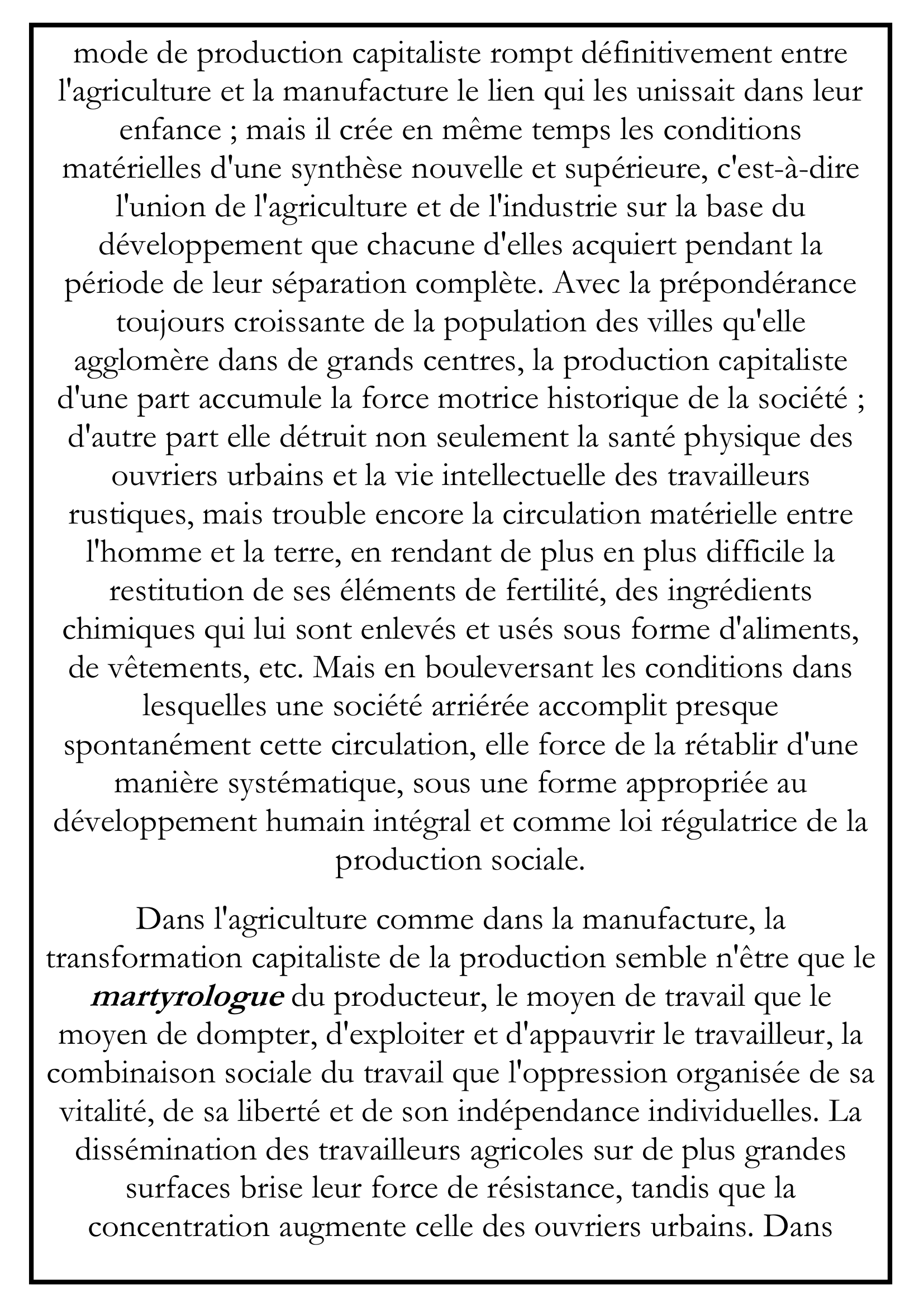 L’exploitation la plus routinière et la plus irrationnelle est remplacée par l’application technologique de la science. Le mode de production capitaliste rompt définitivement entre l’agriculture et la manufacture le lien qui les unissait dans leur enfance ; mais il crée en même temps les conditions matérielles d’une synthèse nouvelle et supérieure, c’est-à-dire l’union de l’agriculture et de l’industrie sur la base du développement que chacune d’elles acquiert pendant la période de leur séparation complète. Avec la prépondérance toujours croissante de la population des villes qu’elle agglomère dans de grands centres, la production capitaliste d’une part accumule la force motrice historique de la société ; d’autre part elle détruit non seulement la santé physique des ouvriers urbains et la vie intellectuelle des travailleurs rustiques, mais trouble encore la circulation matérielle entre l’homme et la terre, en rendant de plus en plus difficile la restitution de ses éléments de fertilité, des ingrédients chimiques qui lui sont enlevés et usés sous forme d’aliments, de vêtements, etc. Mais en bouleversant les conditions dans lesquelles une société arriérée accomplit presque spontanément cette circulation, elle force de la rétablir d’une manière systématique, sous une forme appropriée au développement humain intégral et comme loi régulatrice de la production sociale.