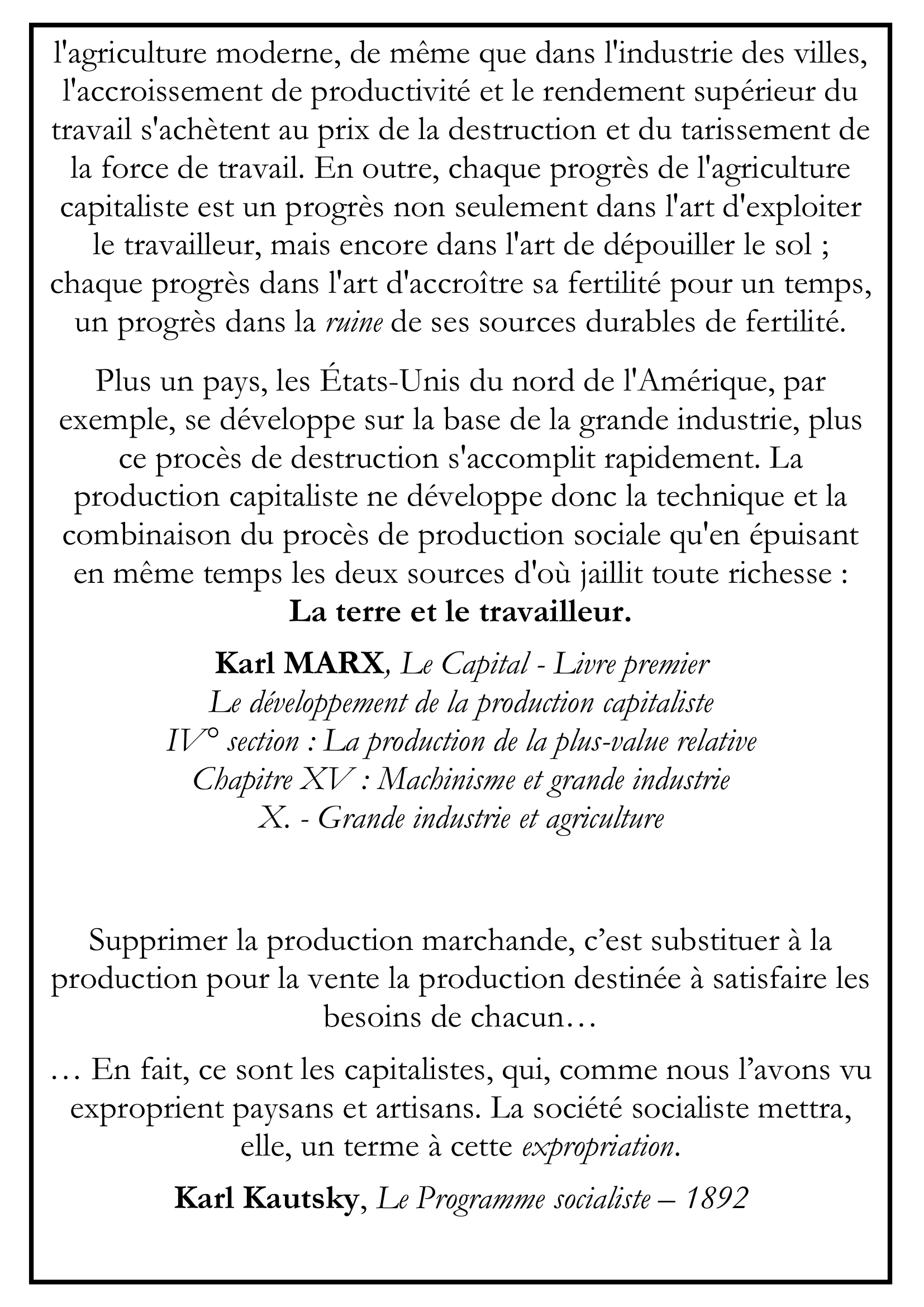 … En fait, ce sont les capitalistes, qui, comme nous l’avons vu exproprient paysans et artisans. La société socialiste mettra, elle, un terme à cette expropriation.