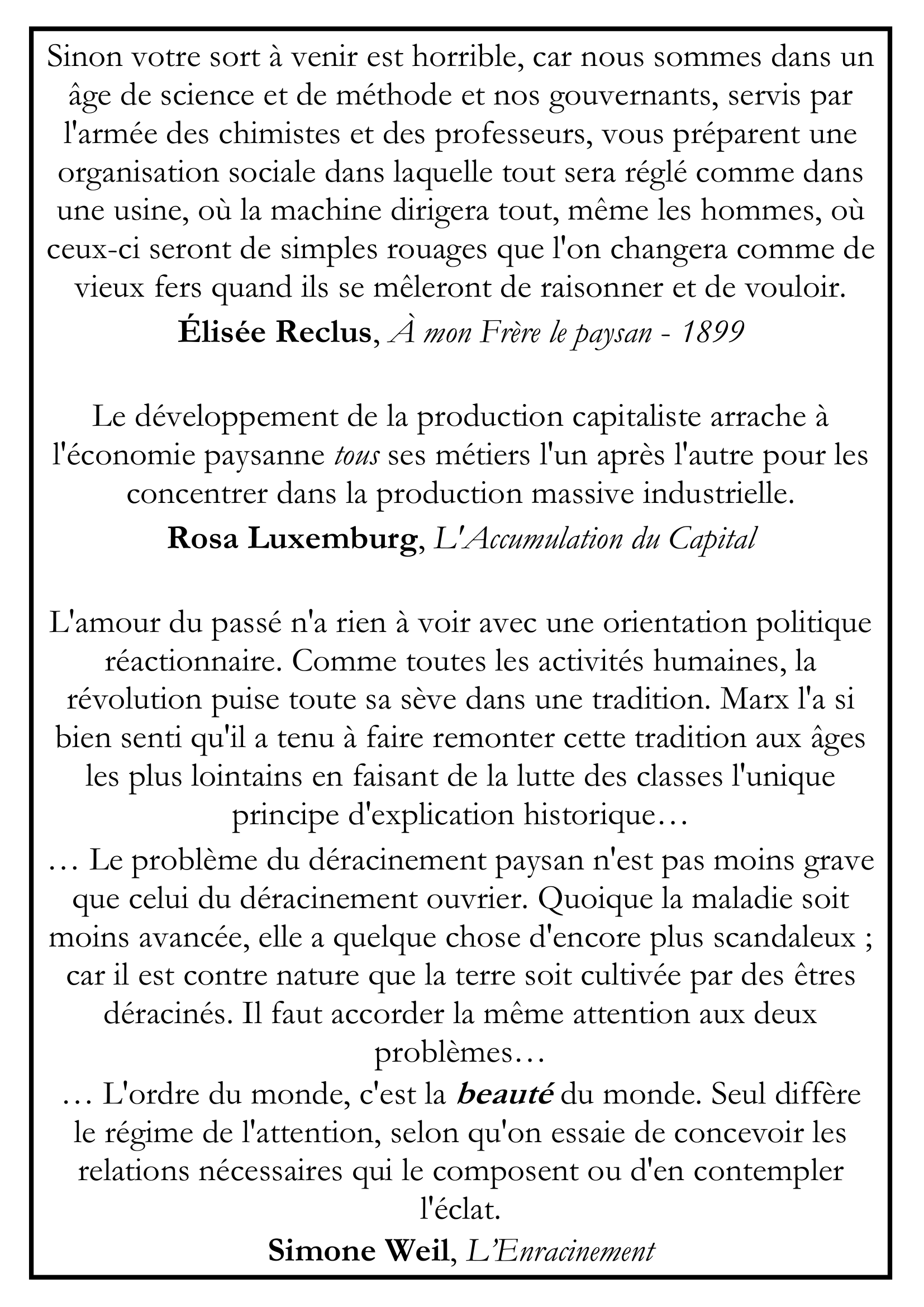 … Le problème du déracinement paysan n’est pas moins grave que celui du déracinement ouvrier. Quoique la maladie soit moins avancée, elle a quelque chose d’encore plus scandaleux ; car il est contre nature que la terre soit cultivée par des êtres déracinés. Il faut accorder la même attention aux deux problèmes…