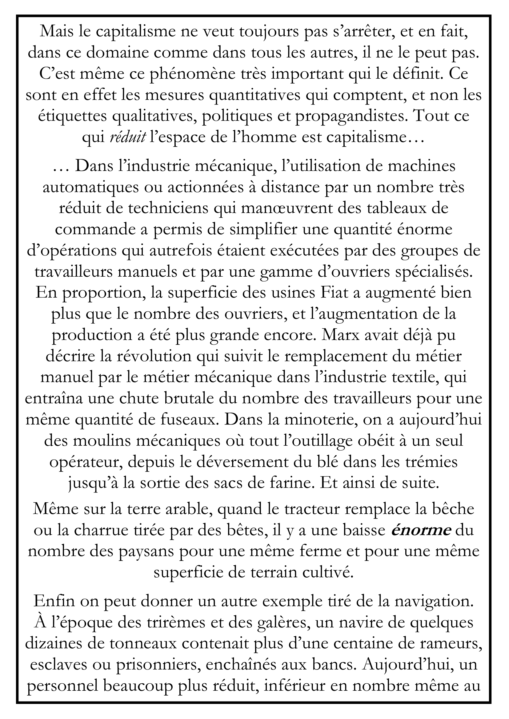 … Dans l’industrie mécanique, l’utilisation de machines automatiques ou actionnées à distance par un nombre très réduit de techniciens qui manœuvrent des tableaux de commande a permis de simplifier une quantité énorme d’opérations qui autrefois étaient exécutées par des groupes de travailleurs manuels et par une gamme d’ouvriers spécialisés. En proportion, la superficie des usines Fiat a augmenté bien plus que le nombre des ouvriers, et l’augmentation de la production a été plus grande encore. Marx avait déjà pu décrire la révolution qui suivit le remplacement du métier manuel par le métier mécanique dans l’industrie textile, qui entraîna une chute brutale du nombre des travailleurs pour une même quantité de fuseaux. Dans la minoterie, on a aujourd’hui des moulins mécaniques où tout l’outillage obéit à un seul opérateur, depuis le déversement du blé dans les trémies jusqu’à la sortie des sacs de farine. Et ainsi de suite.