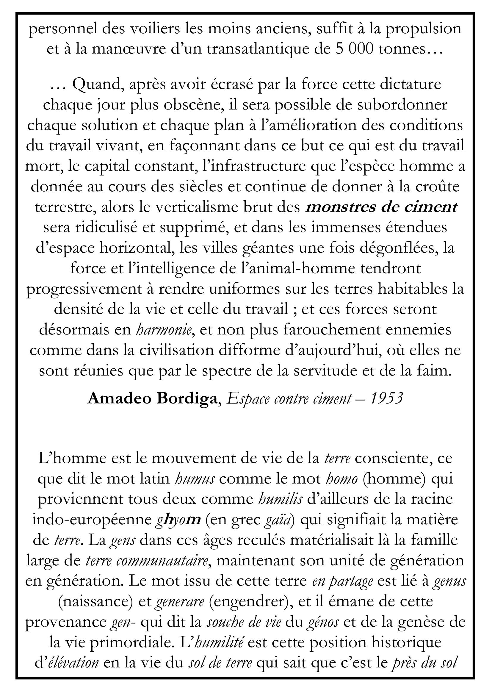… Quand, après avoir écrasé par la force cette dictature chaque jour plus obscène, il sera possible de subordonner chaque solution et chaque plan à l’amélioration des conditions du travail vivant, en façonnant dans ce but ce qui est du travail mort, le capital constant, l’infrastructure que l’espèce homme a donnée au cours des siècles et continue de donner à la croûte terrestre, alors le verticalisme brut des monstres de ciment sera ridiculisé et supprimé, et dans les immenses étendues d’espace horizontal, les villes géantes une fois dégonflées, la force et l’intelligence de l’animal-homme tendront progressivement à rendre uniformes sur les terres habitables la densité de la vie et celle du travail ; et ces forces seront désormais en harmonie, et non plus farouchement ennemies comme dans la civilisation difforme d’aujourd’hui, où elles ne sont réunies que par le spectre de la servitude et de la faim.