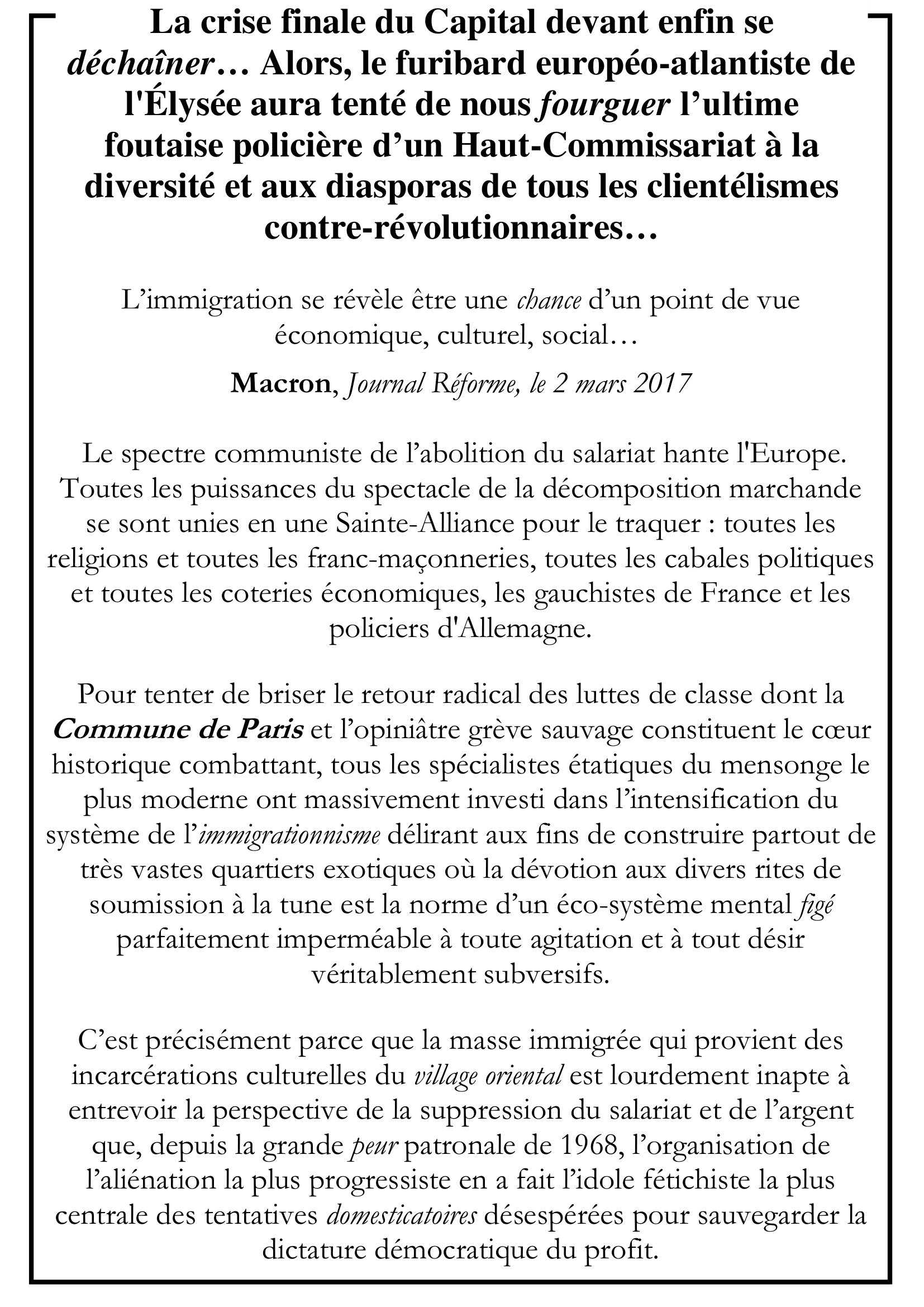 Dès lors, pour tous les temps qui viennent, il va de soi que le regard porté sur l’immigrationnisme capitaliste constitue explicitement ce qui fixe la ligne de démarcation entre révolution et contre-révolution, entre les Belles luttes érotiques maximalistes pour l’éradication de la loi de la valeur et les misérables sollicitations monétisées des ternes quartiers tribalistes où triomphe l’endormissement interminable de toute volupté…
