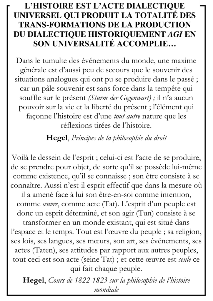 Lire plusL’HISTOIRE EST L’ACTE DIALECTIQUE UNIVERSEL QUI PRODUIT LA TOTALITÉ DES TRANS-FORMATIONS DE LA PRODUCTION DU DIALECTIQUE HISTORIQUEMENT AGI EN SON UNIVERSALITÉ ACCOMPLIE…