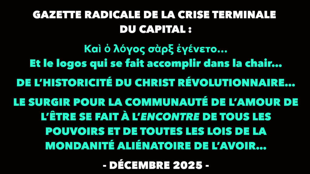Guerre de classe présente : GAZETTE RADICALE DE LA CRISE TERMINALE DU CAPITAL – DÉCEMBRE 2025 Καὶ ὁ λόγος σὰρξ […]